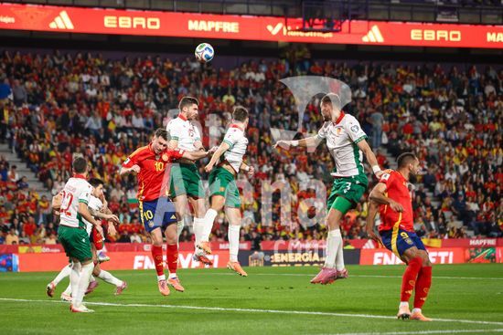 2824284 Aymeric Laporte e Martin Georgiev disputam a bola aérea durante Espanha x Bulgária realizada no Estadio José Zorrilla em Valladolid, CL, nesta terça-feira, 14.