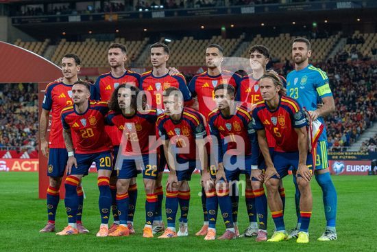 2844745 A selecao espanhola com o novo uniforme da Adidas para a Copa do Mundo de 2026, antes da partida entre Espanha e Turquia, valida pela fase de grupos das Eliminatorias da Copa do Mundo da UEFA, no Estadio de la Cartuja, em Sevilha, Espanha. (Andres Lopez Sheridan / SPP)