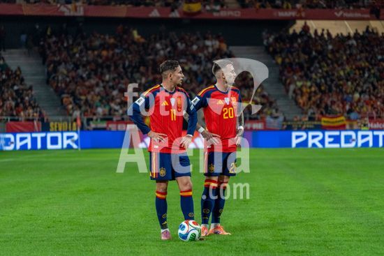 2844750 Yeremi Pino (Espanha N11) e Alex Garcia (Espanha N20) antes de cobrarem uma falta durante a partida das Eliminatorias da Copa do Mundo da UEFA, Grupo E, entre Espanha e Turquia, no Estadio de la Cartuja, em Sevilha, Espanha. (Andres Lopez Sheridan / SPP)