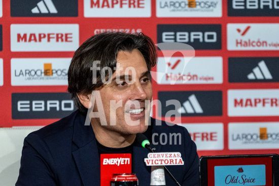 2844779 Luis de la Fuente, tecnico da selecao espanhola, sorrindo durante a coletiva de imprensa apos a partida entre Espanha e Turquia, valida pela fase de grupos das Eliminatorias da Copa do Mundo da UEFA, no Estadio de la Cartuja, em Sevilha, Espanha. (Andres Lopez Sheridan / SPP)
