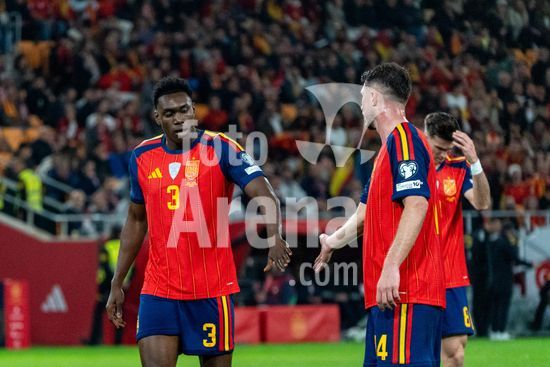 2844778 Samu Aghehowa (Espanha N3) cumprimenta Laporte (Espanha N14) durante a partida das Eliminatorias da Copa do Mundo da UEFA, Grupo E, entre Espanha e Turquia, no Estadio de la Cartuja, em Sevilha, Espanha. (Andres Lopez Sheridan / SPP)