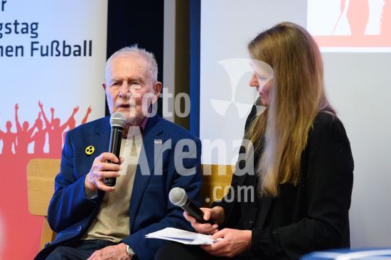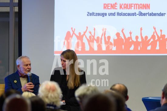 2869080 Munique, Alemanha, 14 de janeiro de 2026: Rene Kaufmann, sobrevivente do Holocausto, e Mara Pfeiffer durante o evento !NieWieder (Nunca Mais) ? Central, que marca o dia da lembranca no futebol alemao, no Estadio Grunwalder, em Munique, Alemanha. (Sven Beyrich/SPP)