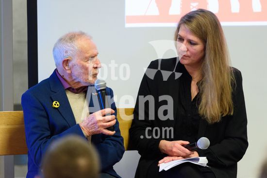 2869077 Munique, Alemanha, 14 de janeiro de 2026: Rene Kaufmann, sobrevivente do Holocausto, e Mara Pfeiffer durante o evento !NieWieder (Nunca Mais) ? Central, que marca o dia da lembranca no futebol alemao, no Estadio Grunwalder, em Munique, Alemanha. (Sven Beyrich/SPP)