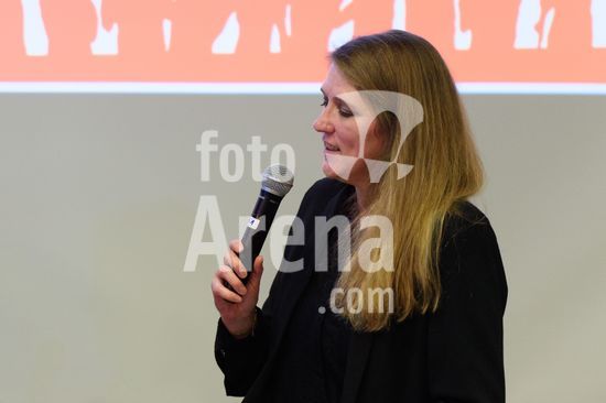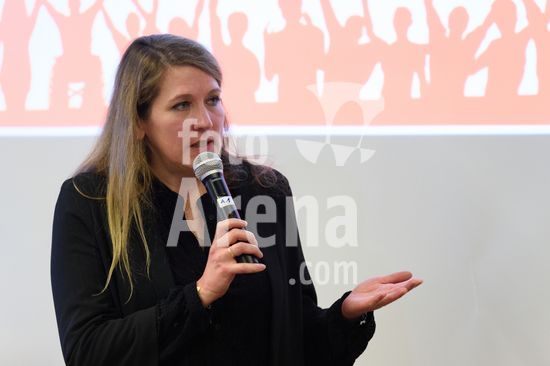 2869095 Munique, Alemanha, 14 de janeiro de 2026: Mara Pfeiffer durante o evento !NieWieder (Nunca Mais) ? Central, que marca o dia da lembranca no futebol alemao, no Estadio Grunwalder, em Munique, Alemanha. (Sven Beyrich/SPP)