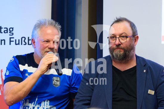 2869082 Munique, Alemanha, 14 de janeiro de 2026: Michael Franke (presidente do FT Gern) e Stefan Lenz (FC Mainaustrasse) durante o evento !NieWieder (Nunca Mais) ? Central, que marcou o dia da lembranca no futebol alemao, no Estadio Grunwalder, em Munique, Alemanha. (Sven Beyrich/SPP)