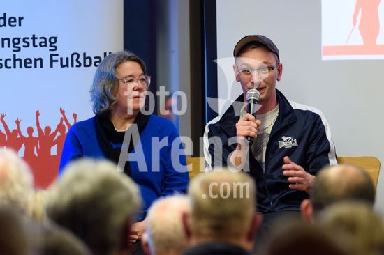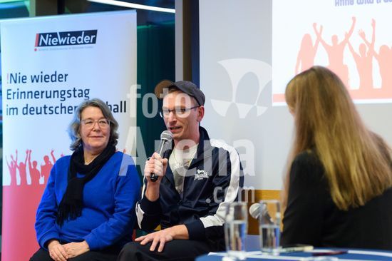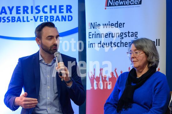 2869089 Munique, Alemanha, 14 de janeiro de 2026: Anne Wild (Centro de Informacao Especializada sobre Extremismo de Direita em Munique) e Conrad Lippert (Roter Stern Leipzig) durante o evento !NieWieder (Nunca Mais) ? Central, que marca o dia da lembranca no futebol alemao, no Estadio Grunwalder, em Munique, Alemanha. (Sven Beyrich/SPP)