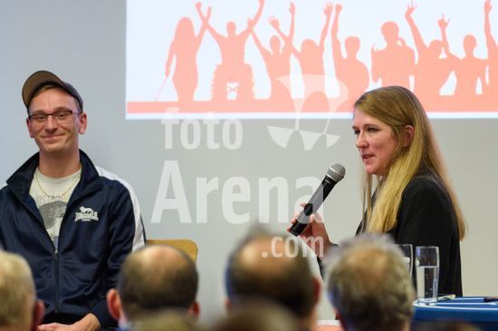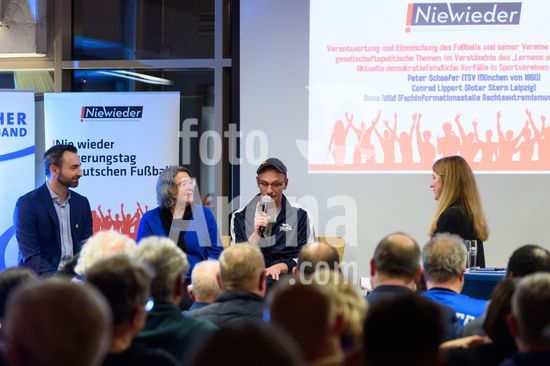 2869091 Munique, Alemanha, 14 de janeiro de 2026: Anne Wild (Centro de Informacao Especializada sobre Extremismo de Direita em Munique) e Conrad Lippert (Roter Stern Leipzig) durante o evento !NieWieder (Nunca Mais) ? Central, que marca o dia da lembranca no futebol alemao, no Estadio Grunwalder, em Munique, Alemanha. (Sven Beyrich/SPP)