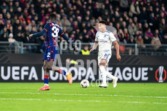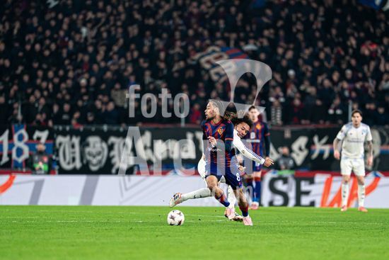 2857931 Evann Guessand (29 Aston Villa), a direita, e Flavius Daniliuc (24 FC Basel 1893), a esquerda, em acao durante a partida da Liga Europa da UEFA entre FC Basel 1893 e Aston Villa no St. Jakob-Park, Basileia, Suica. (Priscila Bütler / SPP)