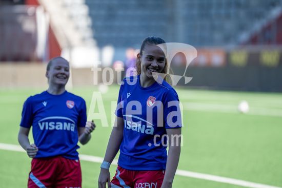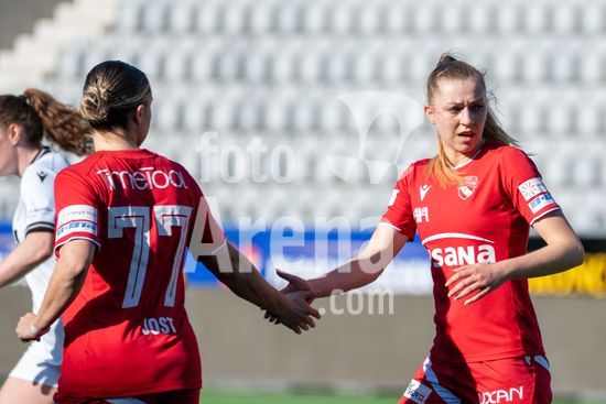 2918920 THUN, BERNA - 4 DE ABRIL: Lara Colpi e Mimoza Hamidi, do FC Thun, comemoram apos marcarem um gol durante a partida da Superliga Feminina entre FC Thun e FC Rapperswil-Jona, na Stockhorn Arena, em 4 de abril de 2026, em Thun, Berna, Suica. (Livio Baeriswyl / SPP)