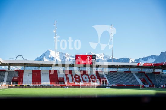 2918937 THUN, BERNA - 4 DE ABRIL: Vista panoramica do estadio com as montanhas ao fundo durante a partida da Superliga Feminina entre FC Thun e FC Rapperswil-Jona na Stockhorn Arena em 4 de abril de 2026 em Thun, Berna, Suica. (Livio Baeriswyl / SPP)