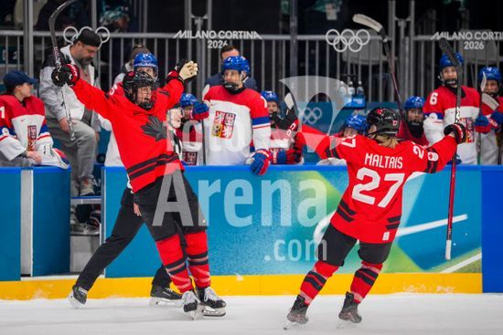 ny090226203712 Players from Canada celebrate after scoring a goal during a preliminary-round women?s ice hockey match against the Czech Republic at the 2026 Milan Cortina Winter Olympics in Milan, Italy, on Monday, Feb. 9, 2026. (Vincent Alban/The New York Times/Fotoarena)