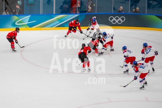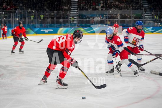 ny090226203711 Players battle for the puck during a preliminary-round women?s ice hockey match between Canada and the Czech Republic at the 2026 Milan Cortina Winter Olympics in Milan, Italy, on Monday, Feb. 9, 2026. (Vincent Alban/The New York Times/Fotoarena)