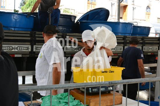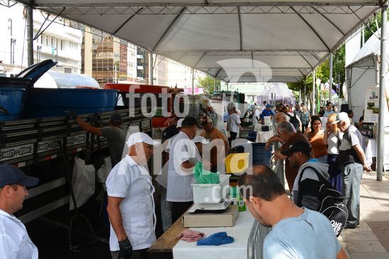 2916846 Imagens da Feira do Peixe Vivo, que vende peixe para o consumo da celebração católica da Semana Santa, localizada na Praça Dante Alighieri, no Centro de Caxias do Sul, em Frente a Catedral de Santa Teresa. Caxias do Sul, RS (01).