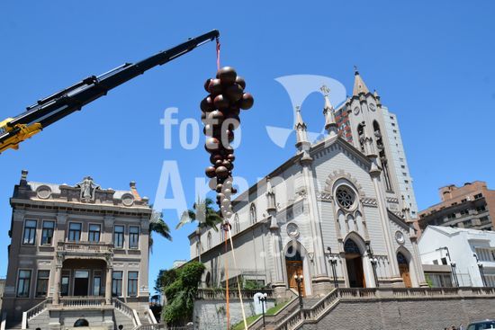 Imagens de um enorme cacho de uvas, instalado na Praça Dante Alighieri, no Centro de Caxias do Sul, em frente a Catedral de Santa Teresa, com seis metros de altura, ficará suspenso por um guincho, chamando a atenção para o evento que se inicia no dia 19 deste mês. A escultura tem a assinatura do artista André Gnatta, da Gnatta Studios 3di. A decoração se soma a alteração das cores do túnel de LED, que já está em roxo e verde, também remetendo a uma das maiores Festas Comunitárias do país. Caxias do Sul, RS (04).