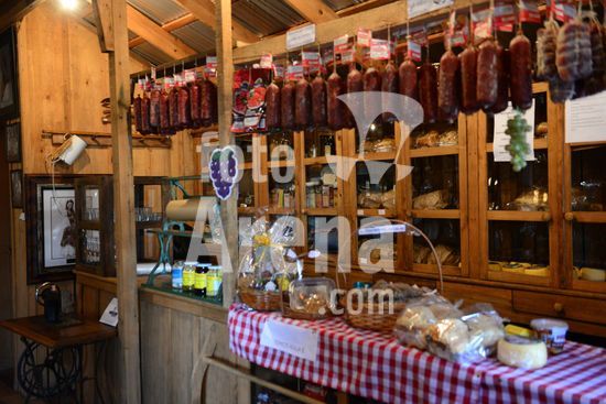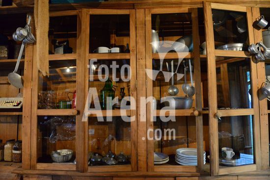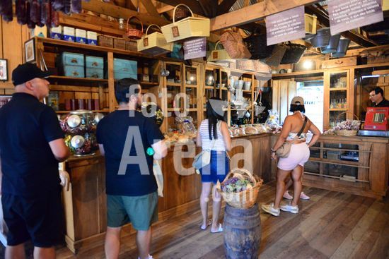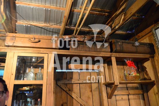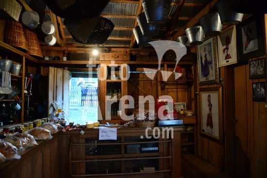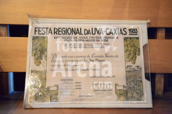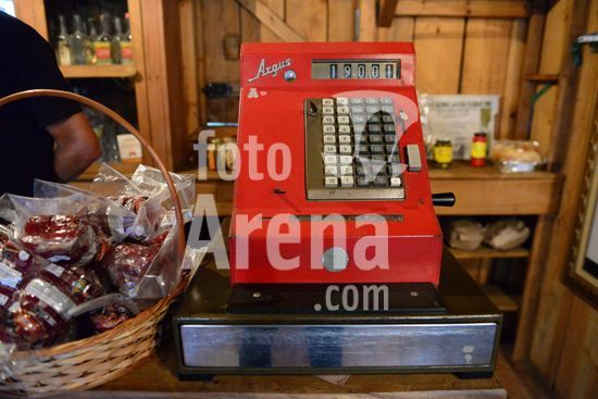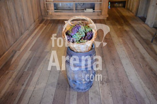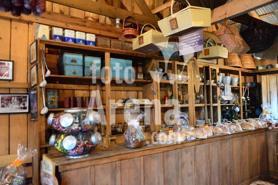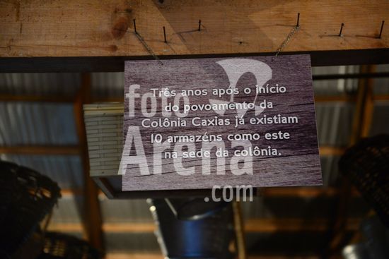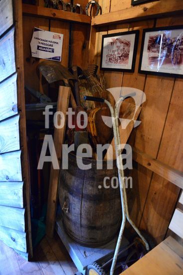 Imagens do Museu do Comércio, localizado no Parque de Eventos Mário Bernardino Ramos, os Pavilhões da Festa da Uva, que apresenta diversos elementos utilizados em uma bodega de época, apresentando a memória da comercialização de produtos. Barril de madeira servindo de apoio para ferramentas de trabalho na agricultura. Caxias do Sul, RS, (03).