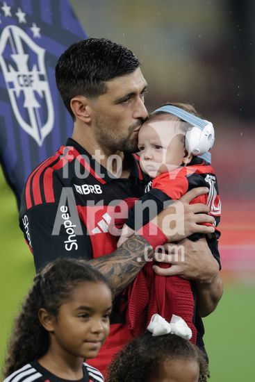 2908080 RIO DE JANEIRO, BRASIL - 19 DE MARÇO: GIORGIAN DE ARRASCAETA do Flamengo beija seu filho antes da partida entre Flamengo e Remo como parte do Brasileirão 2026 no Estádio do Maracanã em 19 de março de 2026 no Rio de Janeiro, Brasil.