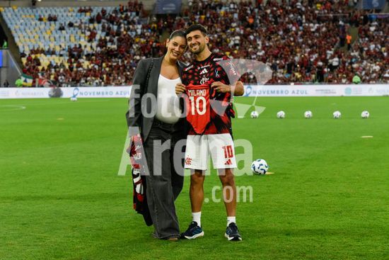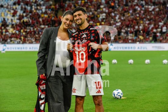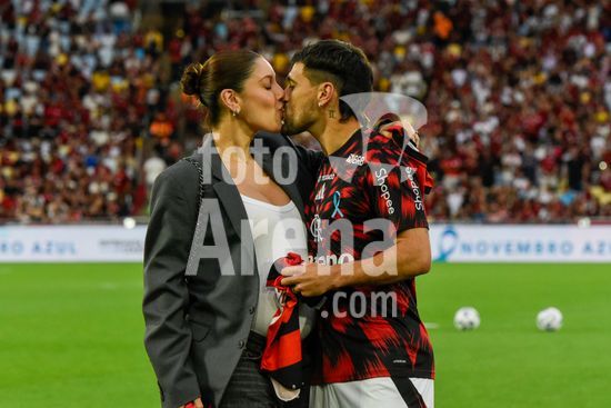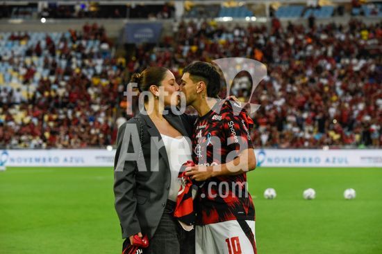 2839769 O jogador Arrascaeta recebe homenagem junto com sua esposa pela renovação de seu contrato com o flamengo até 2028 neste Domingo, 09/11, pelo Campeonato Brasileiro, partida válida pela 33ª rodada. Os times vão a campo no gramado do Maracanã as 18:30 horário de Brasília.