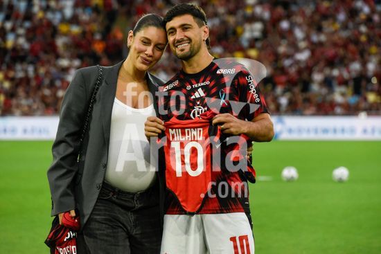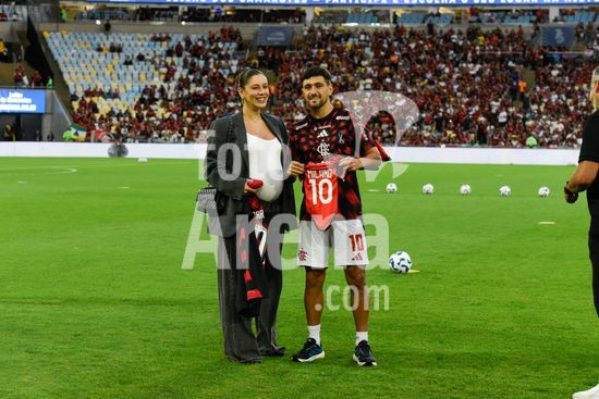 2839767 O jogador Arrascaeta recebe homenagem junto com sua esposa pela renovação de seu contrato com o flamengo até 2028 neste Domingo, 09/11, pelo Campeonato Brasileiro, partida válida pela 33ª rodada. Os times vão a campo no gramado do Maracanã as 18:30 horário de Brasília.