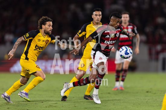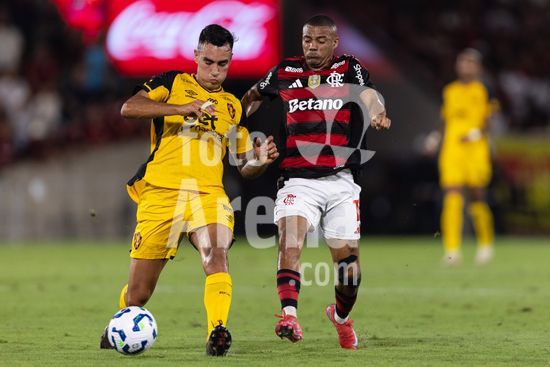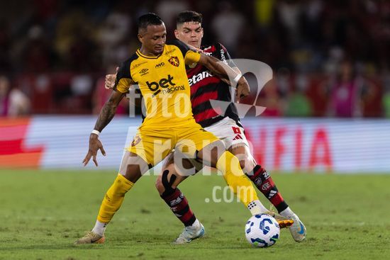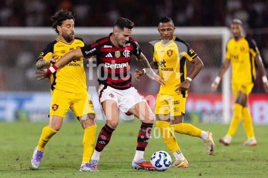2833976 RIO DE JANEIRO, BRASIL - 1 DE OUTUBRO: NICOLAS DE LA CRUZ, do Flamengo, disputa a bola com CHRISTIAN RIVERA, do Sport Recife, durante a partida entre Flamengo e Sport Recife, válida pelo Brasileirão 2025, no Estádio do Maracanã, em 1º de novembro de 2025, no Rio de Janeiro, Brasil.