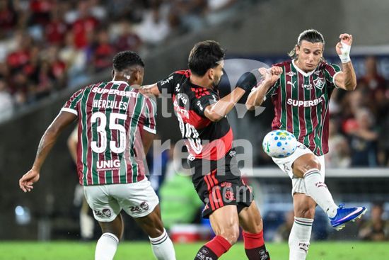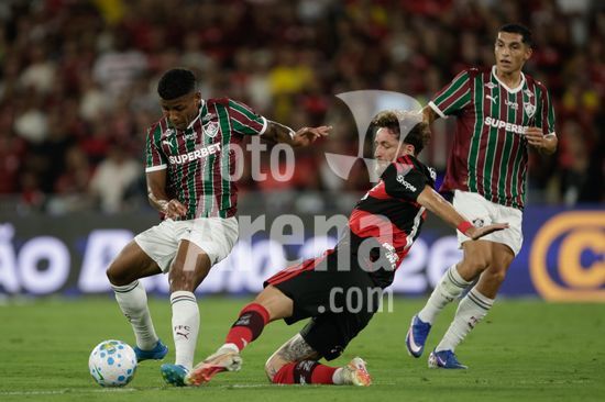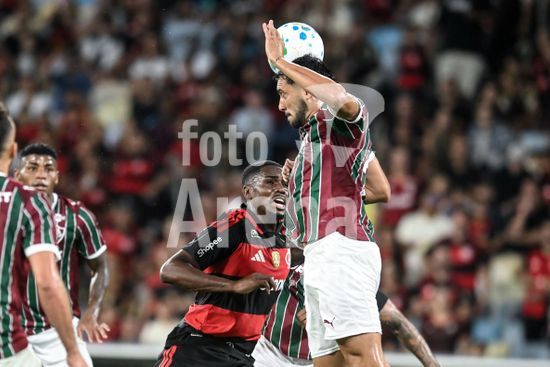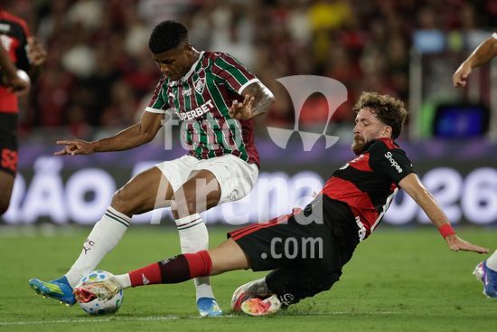 2923759 RIO DE JANEIRO, BRASIL - 12 DE ABRIL: HÉRCULES do Fluminense luta pela bola com LEO PEREIRA do Flamengo durante a partida entre Fluminense e Flamengo no Brasileirão 2026 no Estádio do Maracanã em 12 de abril de 2026 no Rio de Janeiro, Brasil.