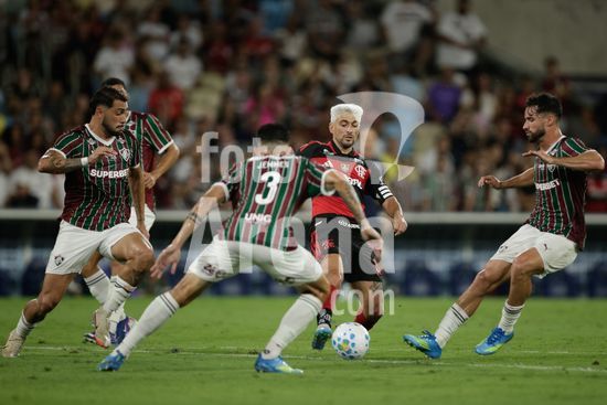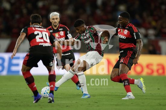 2923892 RIO DE JANEIRO, BRASIL - 12 DE ABRIL: GIORGIAN DE ARRASCAETA do Flamengo luta pela posse de bola com JEMMES do Fluminense durante a partida entre Fluminense e Flamengo no Brasileirão 2026 no Estádio do Maracanã em 12 de abril de 2026 no Rio de Janeiro, Brasil.