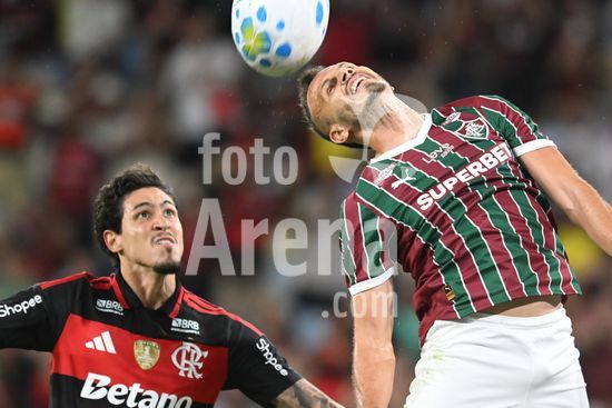2923910 O jogador Rene, do Fluminense, disputa bola com Pedro, durante a partida entre Fluminense e Flamengo, válida pelo Campeonato Brasileiro Série A 2026, no rodada 11, estádio do Maracanã ? 12 de abril de 2026.