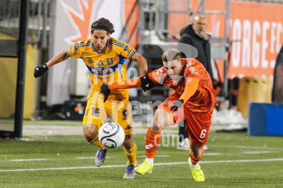 2879093 Diego Lainez (16 Tigres UANL) e Ben Paton (6 Forge FC) em acao durante o jogo de ida da 1ª fase da Copa dos Campeoes da Concacaf entre Forge FC e Tigres UANL no Estadio Hamilton em Hamilton, Canada (APENAS PARA USO EDITORIAL). (Curtis Wong / SPP)