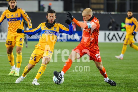 2879175 Fernando Gorriaran (8 Tigres UANL) e Marko Jevremovic (3 Forge FC) em acao durante a partida da primeira etapa da primeira rodada da Copa dos Campeoes da Concacaf entre Forge FC e Tigres UANL no Hamilton Stadium em Hamilton, Canada (SOMENTE PARA USO EDITORIAL). (Curtis Wong / SPP)