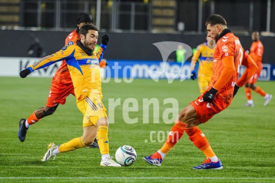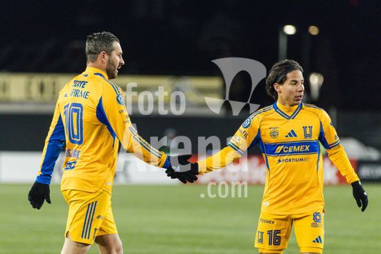 2879154 Andre-pierre Gignac (10 Tigres UANL) e Diego Lainez (Tigres UANL) em acao durante a partida da primeira etapa da primeira rodada da Copa dos Campeoes da Concacaf entre Forge FC e Tigres UANL no Hamilton Stadium em Hamilton, Canada (SOMENTE USO EDITORIAL). (Curtis Wong / SPP)