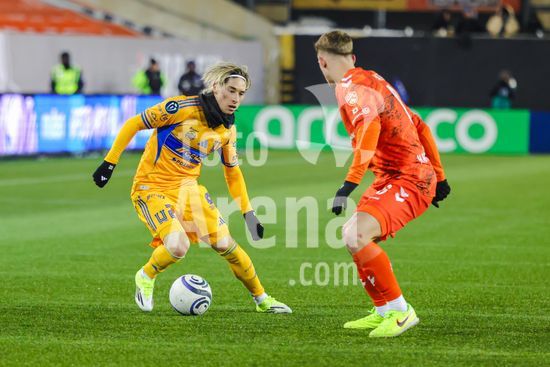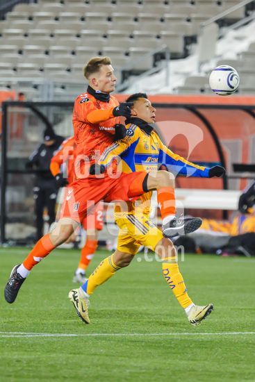 2879091 Diego Lainez (16 Tigres UANL) e Ben Paton (6 Forge FC) em acao durante o jogo de ida da 1ª fase da Copa dos Campeoes da Concacaf entre Forge FC e Tigres UANL no Estadio Hamilton em Hamilton, Canada (APENAS PARA USO EDITORIAL). (Curtis Wong / SPP)
