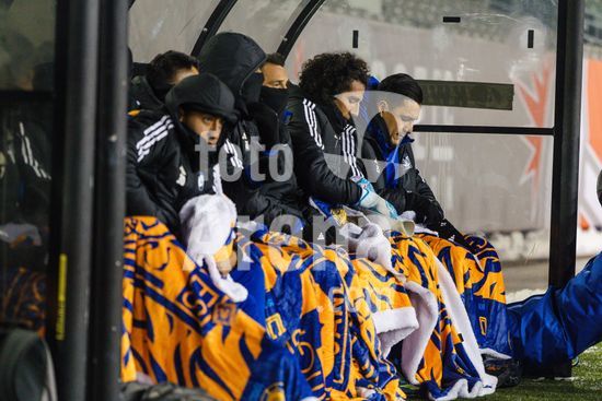 2879146 Jogadores do Tigres UANL se aquecendo no banco de reservas durante o jogo de ida da primeira fase da Copa dos Campeoes da Concacaf entre Forge FC e Tigres UANL no Estadio Hamilton em Hamilton, Canada (APENAS PARA USO EDITORIAL). (Curtis Wong / SPP)