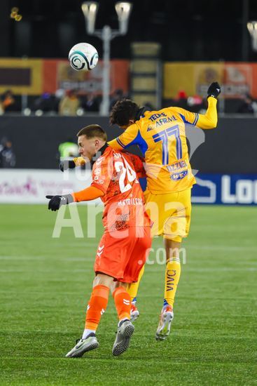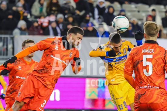 2879167 Rezart Rama (24 Forge FC) e Ozziel Herrera (77 Tigres UANL) disputam uma bola de cabeca durante o jogo de ida da 1ª fase da Copa dos Campeoes da Concacaf entre Forge FC e Tigres UANL no Estadio Hamilton em Hamilton, Canada (APENAS PARA USO EDITORIAL). (Curtis Wong / SPP)