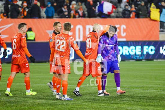 2879169 Jogadores do Forge FC comemorando o resultado da partida durante o jogo de ida da 1ª rodada da Copa dos Campeoes da Concacaf entre Forge FC e Tigres UANL no Estadio Hamilton em Hamilton, Canada (APENAS PARA USO EDITORIAL). (Curtis Wong / SPP)