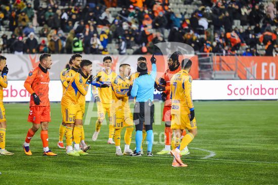 2879184 Jogadores do Tigres UANL reclamando com o arbitro durante o jogo de ida da primeira fase da Copa dos Campeoes da Concacaf entre Forge FC e Tigres UANL no Estadio Hamilton em Hamilton, Canada (APENAS PARA USO EDITORIAL). (Curtis Wong / SPP)