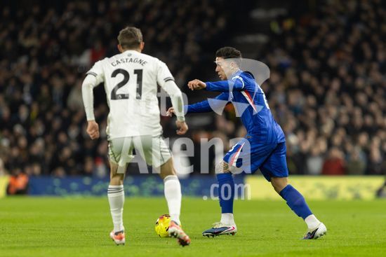 2865556 O capitao Enzo Fernandez, do Chelsea, com a bola, observado por Timothy Castagne, do Fulham, durante a partida da Premier League entre Fulham e Chelsea no Craven Cottage, em 7 de janeiro de 2026, em Londres, Inglaterra. (Pedro Soares / SPP)