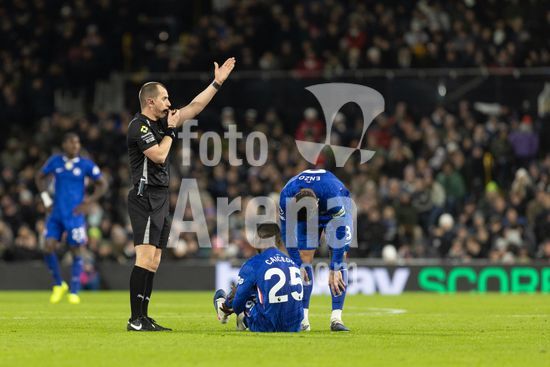 2865589 O arbitro Peter Bankes chama a equipe medica para prestar assistencia a Moises Caicedo, do Chelsea, durante a partida da Premier League entre Fulham e Chelsea no Craven Cottage, em 7 de janeiro de 2026, em Londres, Inglaterra.(Pedro Soares / SPP)