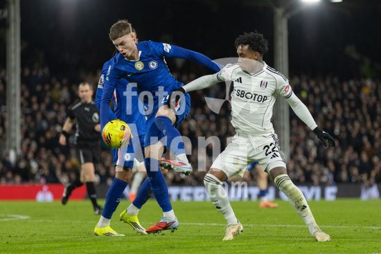 2865615 Jonathan Esenga, do Fulham, defende a bola de Harrison Reed, tambem do Fulham, durante a partida da Premier League entre Fulham e Chelsea, no Craven Cottage, em 7 de janeiro de 2026, em Londres, Inglaterra. (Pedro Soares / SPP)