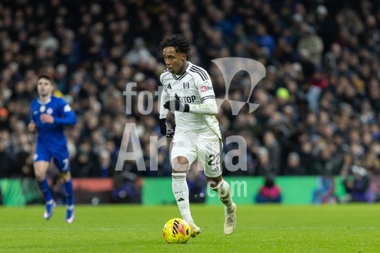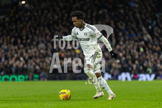 2865607 Ryan Sessegnon, do Fulham, com a bola durante a partida da Premier League entre Fulham e Chelsea no Craven Cottage, em 7 de janeiro de 2026, em Londres, Inglaterra.(Pedro Soares / SPP)