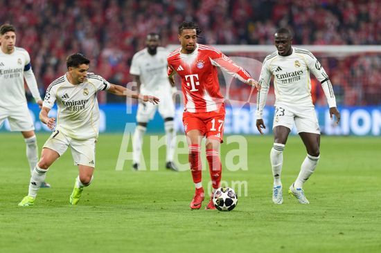 2925698 MUNIQUE, ALEMANHA - 15 DE ABRIL: Michael Olise (17 FC Bayern de Munique), Brahim Diaz (21 Real Madrid) e Ferland Mendy (23 Real Madrid) durante uma partida da Liga dos Campeoes da UEFA 2025/26 entre Bayern de Munique e Real Madrid em Munique, em 15 de abril de 2026. (Sven Beyrich/SPP)