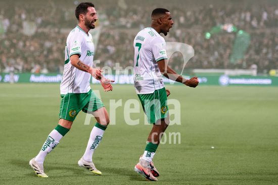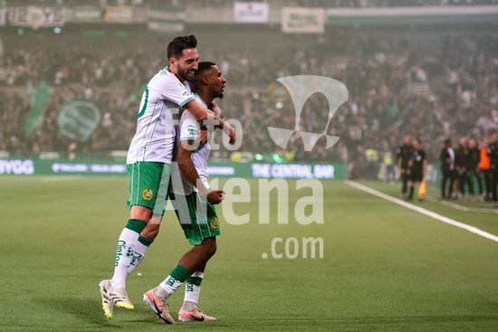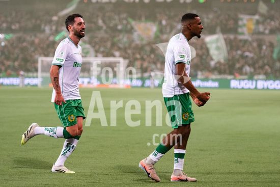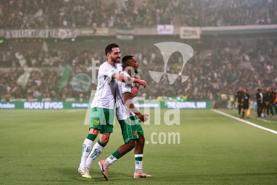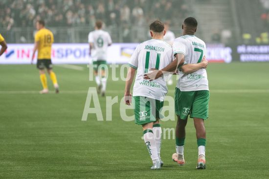 2919559 ESTOCOLMO, SUECIA - 4 DE ABRIL: Paulos Abraham de Hammarby (7) comemora com Oscar Johansson Schellhas de Hammarby (11) depois de marcar 3 a 0 durante o jogo de futebol da Allsvenskan entre Hammarby IF e Mjallby AIF na 3Arena, Estocolmo, Suecia, em 4 de abril de 2026 (Philip Kangas / SPP)