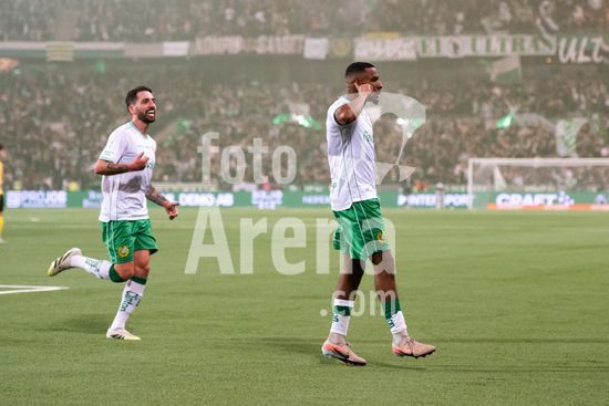 2919479 ESTOCOLMO, SUECIA - 4 DE ABRIL: Paulos Abraham de Hammarby (7) comemora com companheiros de equipe apos marcar 1 a 0 durante o jogo de futebol da Allsvenskan entre Hammarby IF e Mjallby AIF na 3Arena, Estocolmo, Suecia, em 4 de abril de 2026 (Philip Kangas / SPP)