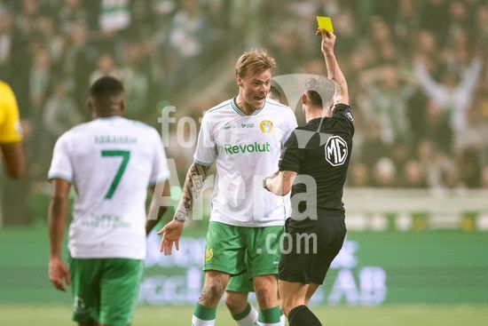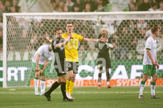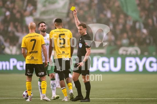 2919515 ESTOCOLMO, SUECIA - 4 DE ABRIL: Axel Noren do Mjallby AIF (4) reage ao receber um cartao amarelo durante o jogo de futebol da Allsvenskan entre Hammarby IF e Mjallby AIF na 3Arena, Estocolmo, Suecia, em 4 de abril de 2026. (Philip Kangas / SPP)