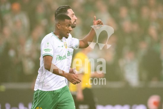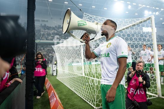 2919509 ESTOCOLMO, SUECIA - 4 DE ABRIL: Paulos Abraham de Hammarby (7) comemora com os fas apos o jogo de futebol Allsvenskan entre Hammarby IF e Mjallby AIF na 3Arena, Estocolmo, Suecia, em 4 de abril de 2026. (Philip Kangas / SPP)
