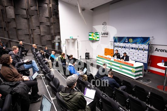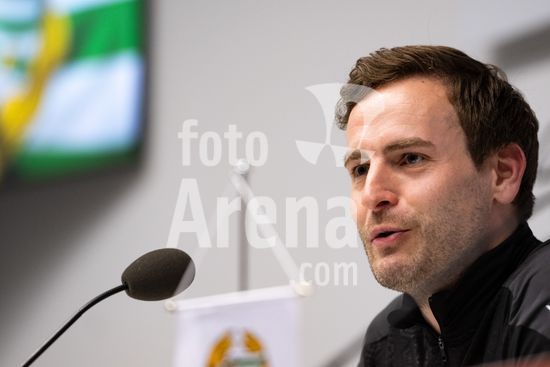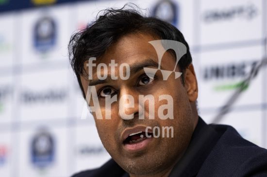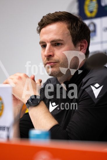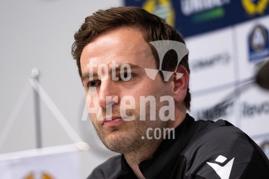 2919505 ESTOCOLMO, SUECIA - 4 DE ABRIL: Tecnico Karl Marius Aksum do Mjallby AIF durante a coletiva de imprensa apos o jogo de futebol Allsvenskan entre Hammarby IF e Mjallby AIF na 3Arena, Estocolmo, Suecia. (Philip Kangas / SPP)