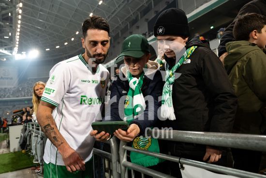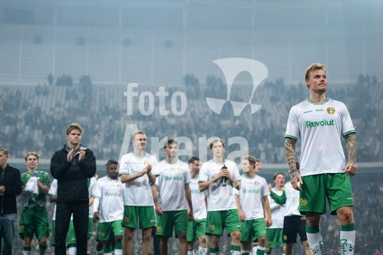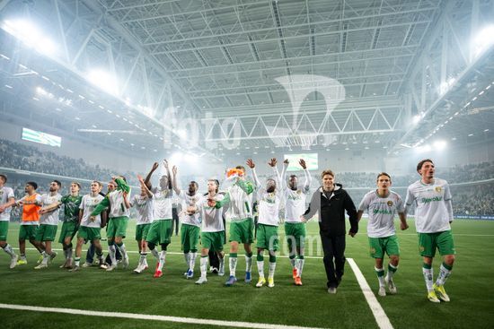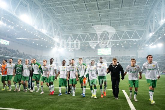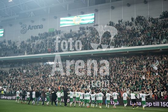 2919529 ESTOCOLMO, SUECIA - 4 DE ABRIL: Os jogadores do Hammarby agradecem aos torcedores apos o jogo de futebol Allsvenskan entre Hammarby IF e Mjallby AIF na 3Arena, Estocolmo, Suecia, em 4 de abril de 2026. (Philip Kangas / SPP)