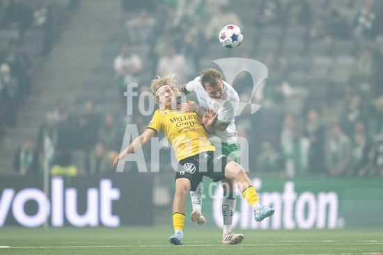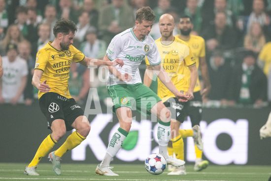 2919556 ESTOCOLMO, SUECIA - 4 DE ABRIL: Villiam Granath de Mjallby AIF (14) e Victor Stange Lind de Hammarby (9) durante o jogo de futebol Allsvenskan entre Hammarby IF e Mjallby AIF em 3Arena, Estocolmo, Suecia, em 4 de abril de 2026. (Philip Kangas / SPP)