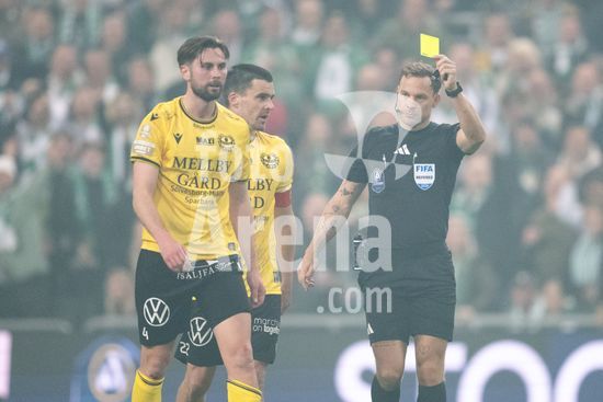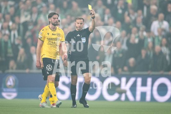 2919476 ESTOCOLMO, SUECIA - 4 DE ABRIL: Nahir Besara de Hammarby (20) recebe cartao amarelo do arbitro durante o jogo de futebol Allsvenskan entre Hammarby IF e Mjallby AIF na 3Arena, Estocolmo, Suecia, em 4 de abril de 2026. (Philip Kangas / SPP)
