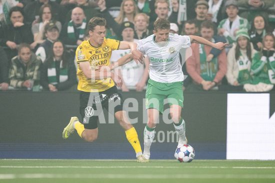 2919569 ESTOCOLMO, SUECIA - 4 DE ABRIL: Hampus Skoglund de Hammarby (2) e Viktor Gustafson de Mjallby AIF (7) durante o jogo de futebol Allsvenskan entre Hammarby IF e Mjallby AIF em 3Arena, Estocolmo, Suecia, em 4 de abril de 2026. (Philip Kangas / SPP)