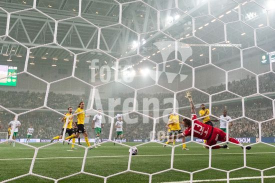2919566 ESTOCOLMO, SUECIA - 4 DE ABRIL: Paulos Abraham de Hammarby (7) marca 3 a 0 contra o goleiro Robin Wallinder do Mjallby AIF (13) durante o jogo de futebol da Allsvenskan entre Hammarby IF e Mjallby AIF na 3Arena, Estocolmo, Suecia, em 4 de abril de 2026 (Philip Kangas / SPP)