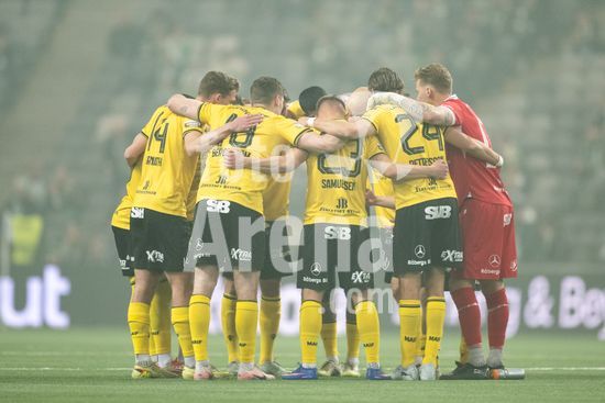 2919570 ESTOCOLMO, SUECIA - 4 DE ABRIL: Jogadores de Mjallby antes do inicio do segundo tempo durante o jogo de futebol Allsvenskan entre Hammarby IF e Mjallby AIF em 3Arena, Estocolmo, Suecia, em 4 de abril de 2026. (Philip Kangas / SPP)